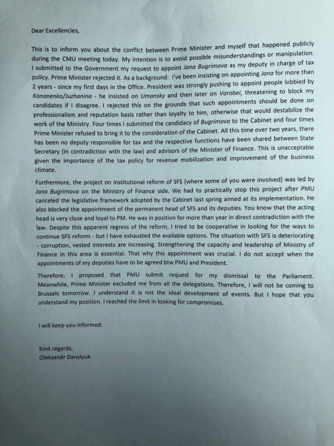 "Предыстория: я настаивал на назначении Яны [Бугримовой – ред.] более двух лет – с первых дней работы в министерстве. Президент решительно проталкивал лоббируемых Кононенко/Южаниной людей: настаивал на Уманском [Игорь Уманский, экс-первый заместитель министра финансов – ред.], позже – на Воробей [Светлана Воробей, заместитель руководителя секретариата комитета ВР по налоговой и таможенной политике – ред.], угрожая блокировать моих кандидатов в случае моего несогласия", – указывается в письме.