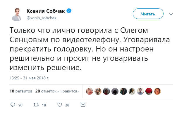 "Только что лично говорила с Олегом Сенцовым по видеотелефону. Уговаривала прекратить голодовку. Но он настроен решительно и просит не уговаривать изменить решение", - отметила она.