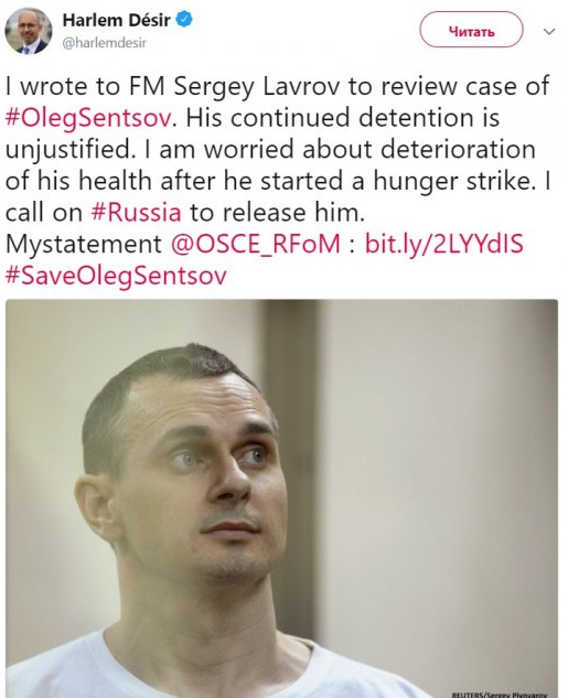 Представитель ОБСЕ по вопросам свободы СМИ Арлем Дезир обратился к министру иностранных дел России Сергею Лаврову с просьбой посодействовать освобождению незаконно осужденного в РФ Олега Сенцова. Об этом представитель ОБСЕ написал у себя в Twitter.