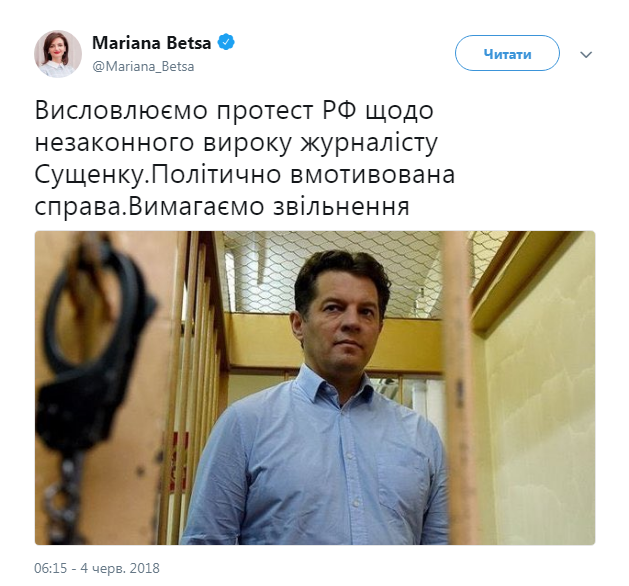 Министерство иностранных дел Украины выразило протест России в связи с незаконным приговором украинскому журналисту Роману Сущенко и требует освободить его. Об этом сообщила пресс-секретарь МИД Марьяна Беца в Twitter.