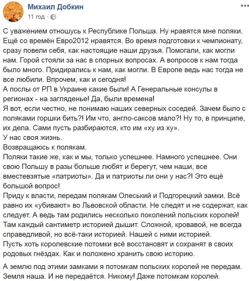 Приду к власти, передам полякам Олеський и Подгорецкий замки. Всё равно их "убивают" во Львовской области. Не следят и не содержат, как следует. А ведь там родились несколько поколений польских королей!", - заявил М.Добкин.