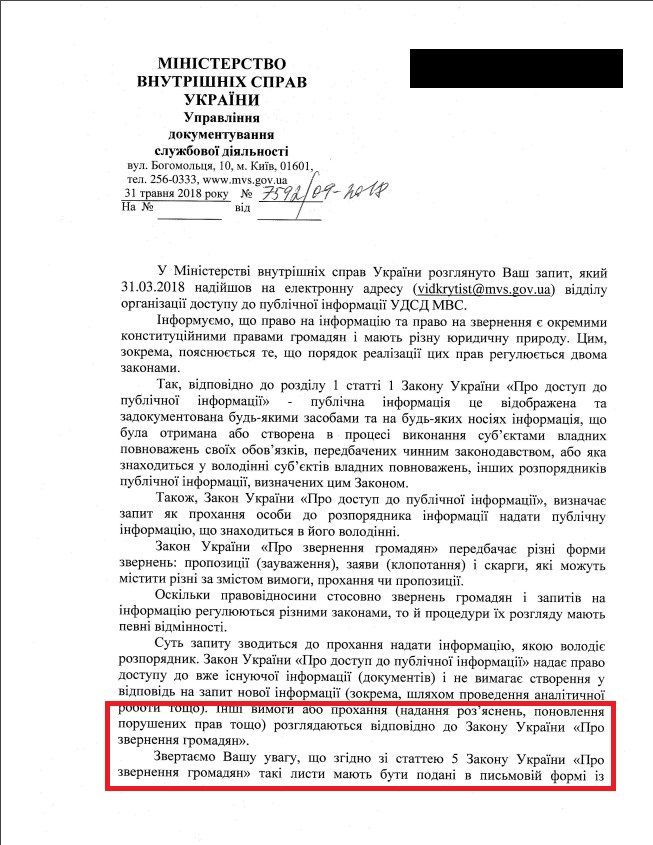 Однако Управление документирования служебной деятельности МВД Украины решило уклониться от ответа на поставленный вопрос об осведомленности министра Авакова о проведении спецоперации СБУ. В ответе МВД рекомендует направить обращение на имя Авакова, а не запрос о доступе к публичной информации.