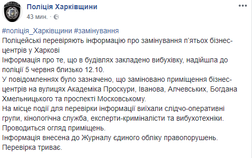 Информация о том, что в зданиях заложена взрывчатка, поступило около 12:10. В сообщениях было указано, что заминировано помещение бизнес-центров на улицах Академика Проскуры, Иванова, Алчевских, Богдана Хмельницкого и проспекте Московском.