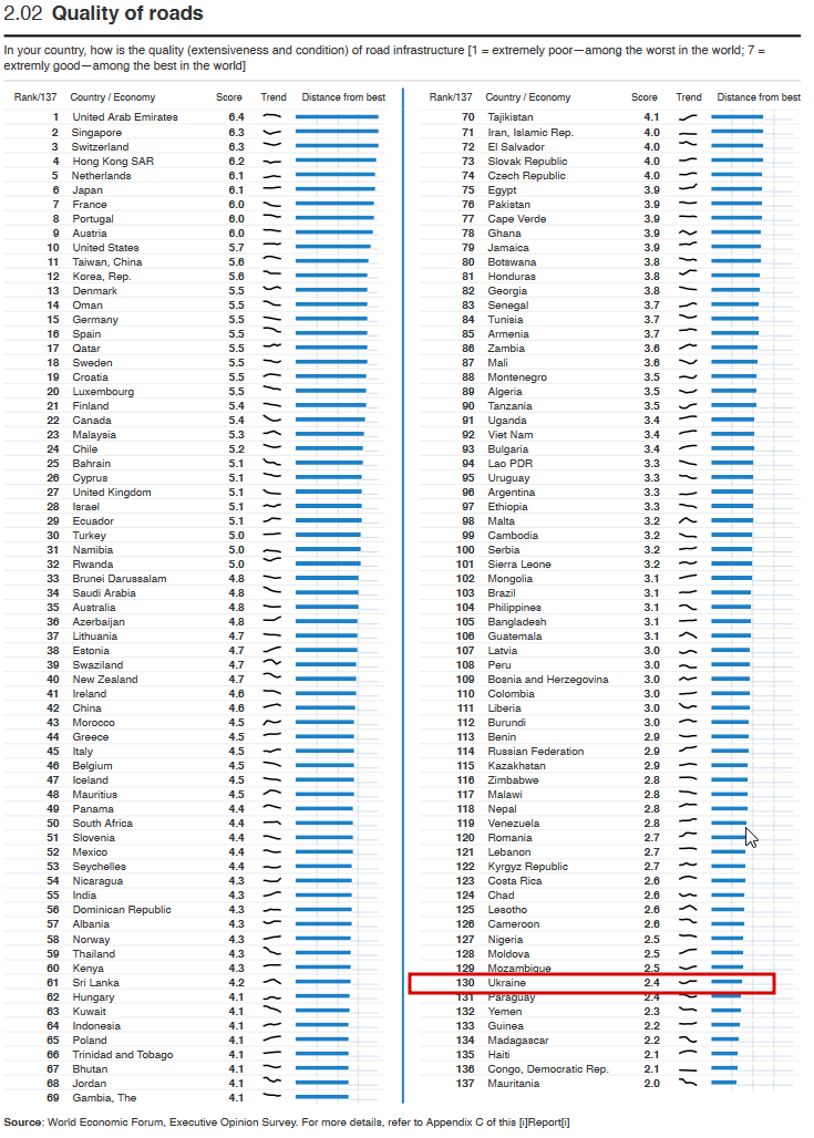 Согласно рейтингу, хуже украинских дороги лишь в Парагвае, Йемене, Гвинее, Мадагаскаре, Гаити и Конго. Последнее место в рейтинге заняла Мавритания.
