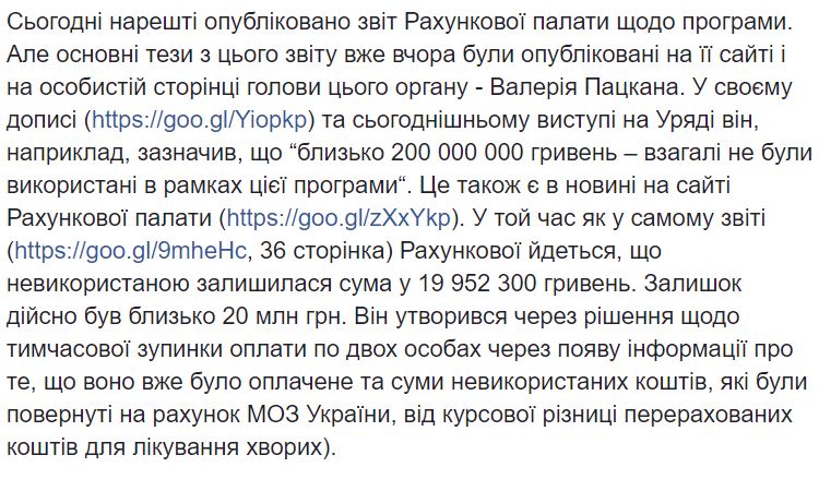 "Остаток действительно был около 20 млн грн. Он образовался из-за решения по временной остановки оплаты по двум лицам из-за появления информации о том, что лечение уже было оплачено и суммы неиспользованных средств, которые были возвращены на счет Минздрава Украины, от курсовой разницы перечисленных средств для лечения больных)", - написала Супрун.