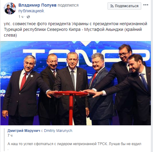 Президент Украины Петр Порошенко оказался на совместном фото с главой ныне непризнанной Турецкой республики Северного Кипра - Мустафой Акынджи (крайний слева).