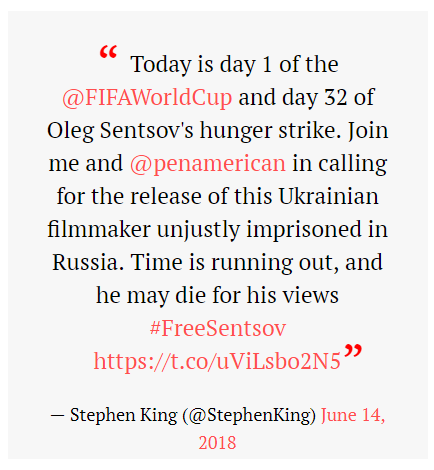 "Сегодня первый день Чемпионата мира по футболу и 32 день голодовки Олега Сенцова. Присоединяйтесь ко мне и ПЕН-центру с призывами к освобождению этого украинского режиссера, несправедливо заключенного в России. Время идет, и он может умереть за свои взгляды", - написал он.