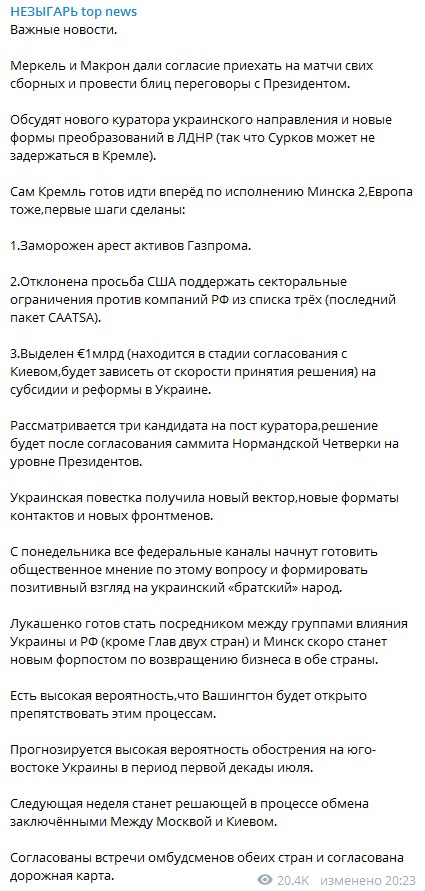 Интересно, что сюжеты описанные в сливе НеЗыгаря частично нашли подтверждение уже сегодня. В частности, стало известно, что президент Франции Эммануель Макрон призвал Петра Порошенко сделать быстрые меры по внедрению договоренностей нормандского формата. Речь идет о соблюдении режима прекращения огня, защиты гражданской инфраструктуры, а также соблюдения Минских соглашений. Президенты обсудили необходимость внедрения миротворческой миссии ООН на всей оккупированной территории Донбасса.