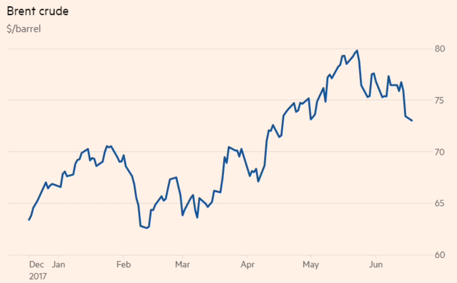 Цена нефти марки Brent в понедельник, 18 июня снизилась до минимального значения за 6 недель перед ключевой встречей крупных производителей, которая должна состояться на этой неделе.