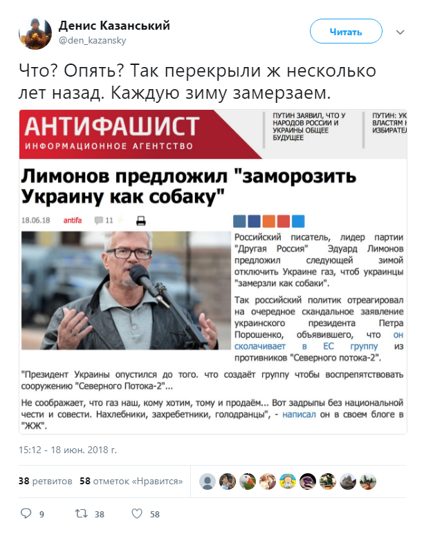 Пользователи интернета подняли на смех угрозы известного путинского пропагандиста, писателя и лидера партии "Другая Россия" Эдуарда Лимонова, который предложил следующей зимой отключить Украине газ, чтобы украинцы "замерзли, как собаки".
