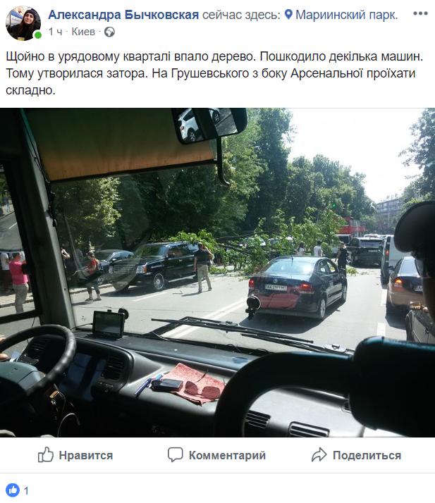 В пятницу, 22 июня, в правительственном квартале Киева дерево упало прямо на машины.