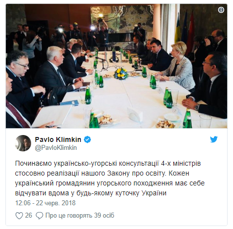 "Начинаем украинско-венгерские консультации четырех министров по реализации нашего Закона об образовании. Каждый украинский гражданин венгерского происхождения должен себя чувствовать дома в любом уголке Украины", - написал Климкин.