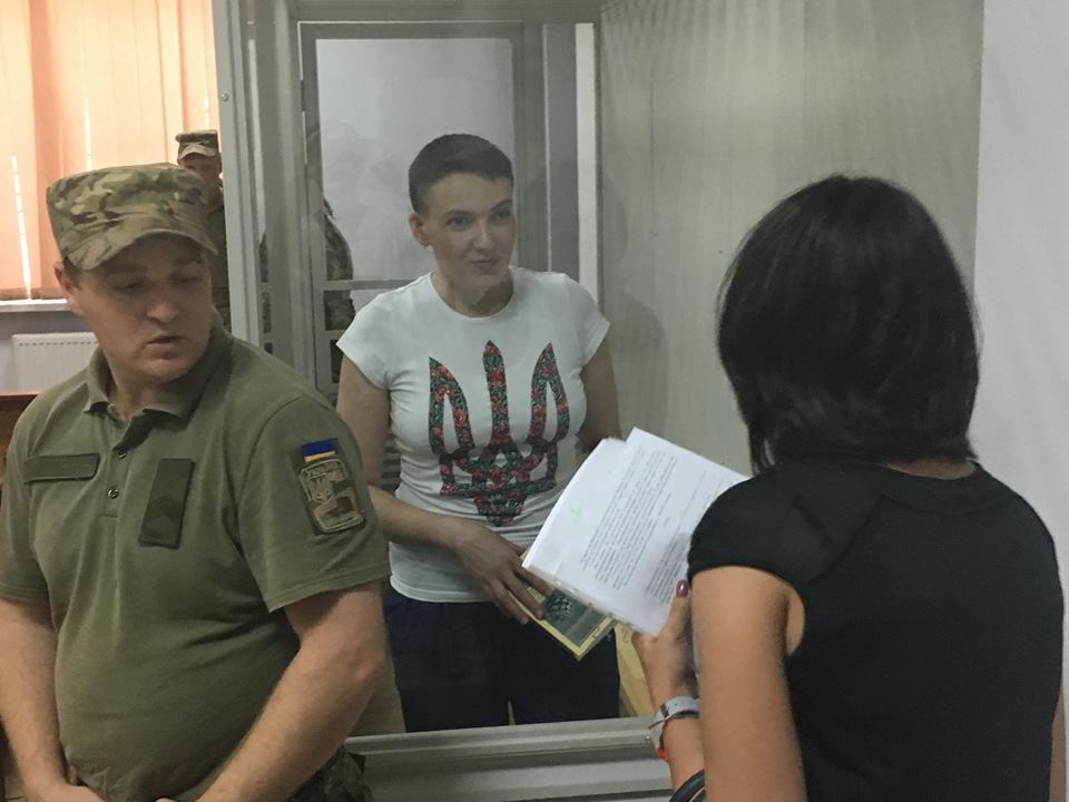 В зале суда Савченко находится в стеклянном боксе.