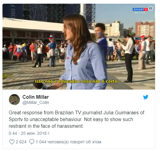 Бразильская журналистка Джулия Гимарайс стала уже второй жертвой домогательств в прямом эфире на ЧМ-2018 в России.