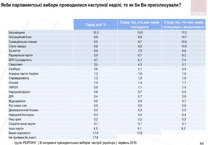 Согласно опросу, партийный рейтинг возглавляет "Батькивщина", которую готовы поддержать 17% тех, кто намерен прийти на выборы и определился.