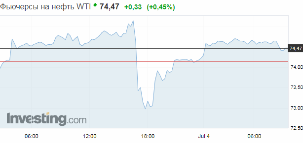 Августовский контракт на нефть WTI на электронных торгах Нью-йоркской товарной биржи (NYMEX) подорожал на до 74,47 доллара за баррель.
