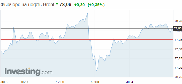Так, цена сентябрьских фьючерсов на нефть Brent на лондонской бирже ICE Futures к 9:34 по киевскому времени повысилась до 78,06 доллара за баррель.