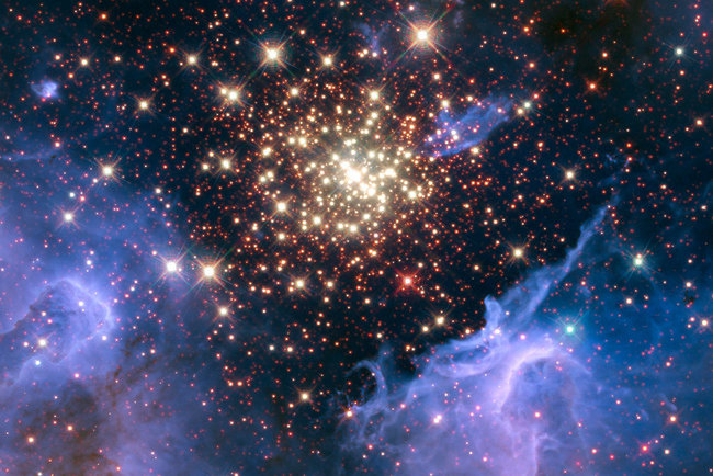 Туманность находится в 20 тыс. световых лет от Земли. Необычайный эффект фейерверка достигнут за счет образования звезд в одинаковое время, но все они различаются по массе, температуре и цвету.
