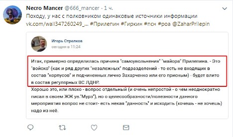 Бывший так называемый "министр обороны ДНР" Игорь Стрелков (Гиркин) заявил, что российский писатель, боевик так называемой ДНР Захар Прилепин решил покинуть группировку, поскольку его "войско" в скором времени войдет в состав так называемых "регулярных ВС ЛДНР".