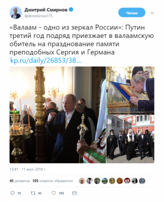 По его словам, Путин третий год подряд на день празднования памяти преподобных Сергия и Германа посещает обитель на Валааме.