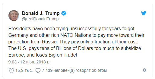 "В течение многих лет президенты безуспешно пытались заставить Германию и другие богатые страны НАТО платить больше за защиту от России. Они платят лишь небольшую часть. США платят десятки миллиардов долларов – слишком много, чтобы субсидировать Европу, и теряют много на торговле", – заявил Трамп.