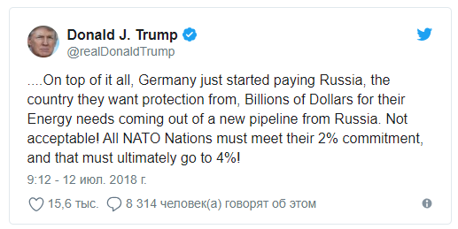 "Дополнительно Германия начала платить России, стране, от которой они хотят защититься, миллиарды долларов за их энергетические потребности с нового трубопровода из России. Недопустимо! Все страны НАТО должны выполнить свои обязательства в размере 2%, и в конечном итоге это должно составить 4%", – добавил Трамп.