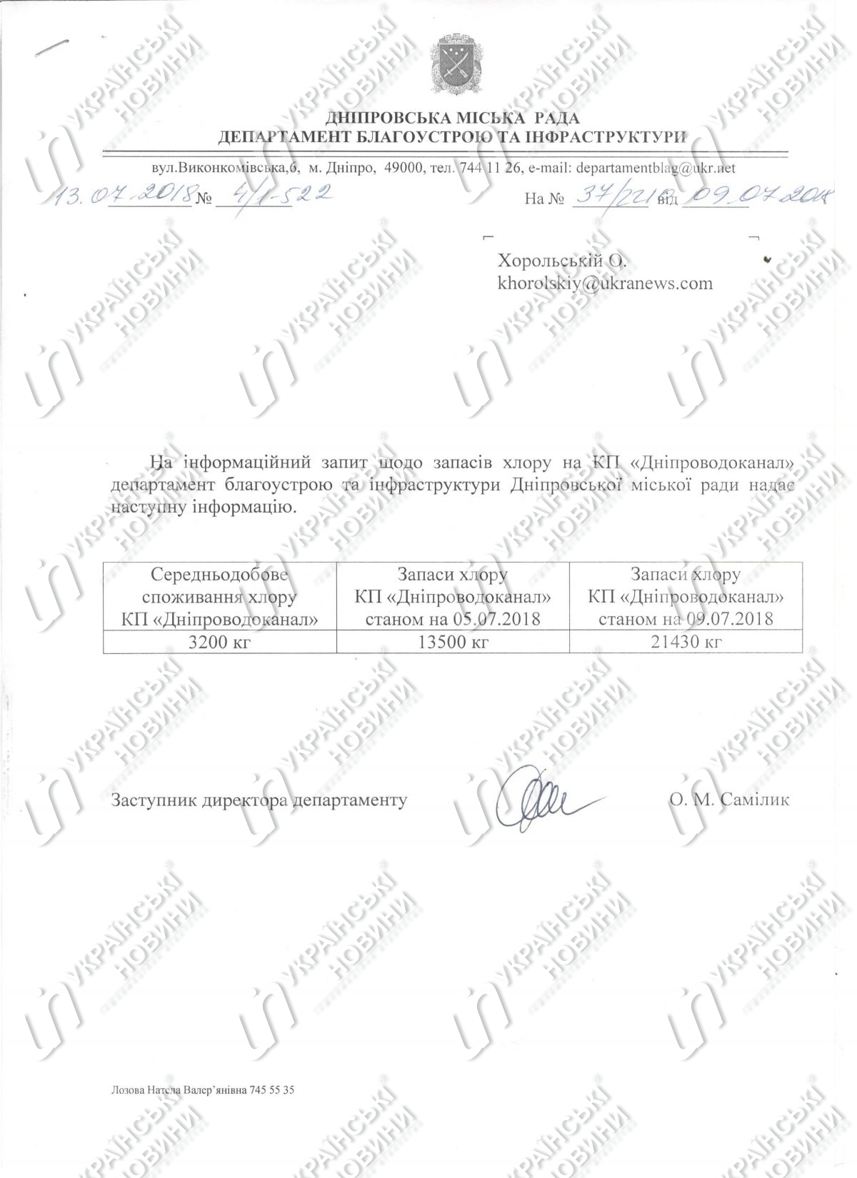 нипровский городской совет сообщает, что запасов хлора для обеззараживания питьевой воды на коммунальном предприятии (КП) "Днипроводоканал" осталось на 7 дней.