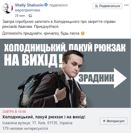 "Завтра попробуем спросить у Холодницкого о закрытии дела рюкзаков Авакова. Присоединяйтесь. Помогите придумать кричалку, пожалуйста", - говорится в анонсе мероприятия, которым интересуются около 200 человек.