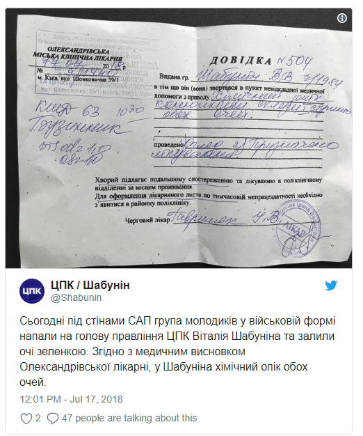 Как позже сообщил ЦПК в своем Twitter, у Шабунина диагностированы химические ожоги глаз после того, как его облили зеленкой.