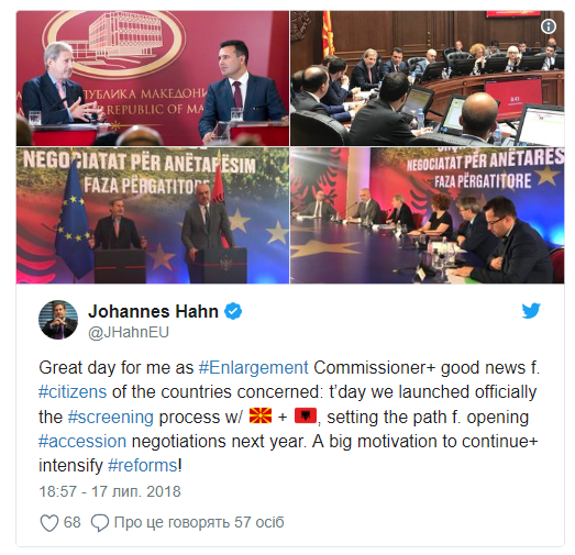 "Сегодня мы официально начали процедуру проверки с Македонией и Албанией, определив путь для открытия переговоров о вступлении в следующем году. Большая мотивация продолжать и интенсифицировать реформы!", - написал Хан в Twitter.