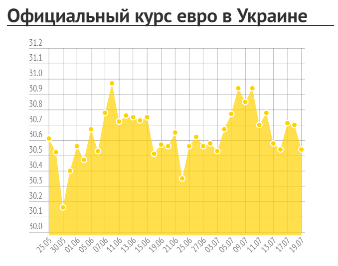 Курс евро снизился на 16 копеек, вновь отдалившись от психологической отметки в 31 грн, у которой торговался на прошлой неделе.