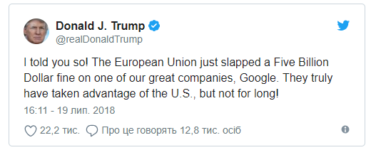 "А я что говорил! Европейский Союз наложил штраф в размере 5 миллиардов долларов на одну из наших крупнейших компаний, Google. Они действительно используют США, но это ненадолго!", - написал Трамп.