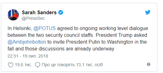 По ее словам, Трамп попросил советника по национальной безопасности президента США Джона Болтона пригласить Путина посетить Вашингтон этой осенью.