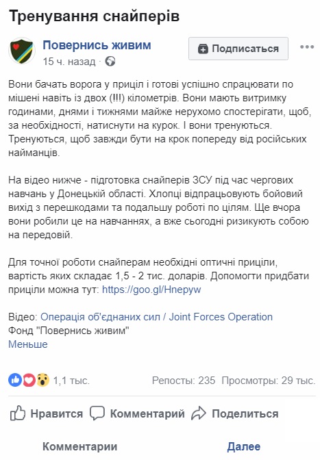 "Они (снайперы) видят врага в прицел и готовы успешно сработать по мишени даже с двух (!!!) километров. Они имеют выдержку часами, днями и неделями почти неподвижно наблюдать, чтобы при необходимости нажать на курок. И они тренируются. Тренируются, чтобы всегда быть на шаг впереди российских наемников", - говорится в описании видео.