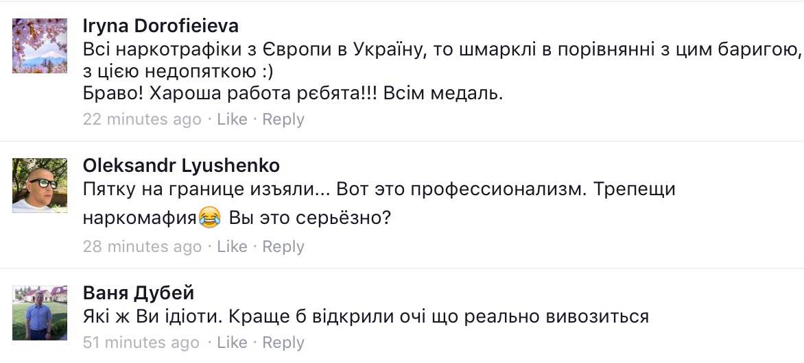Другие пользователи отмечают: «Спасибо, поржал. Там килограммами провозят, а они одного торчка с пакетиком задержали», «Все наркотрафики из Европы в Украину – это сопли по сравнению с этим барыгой. Браво! Всем медаль».