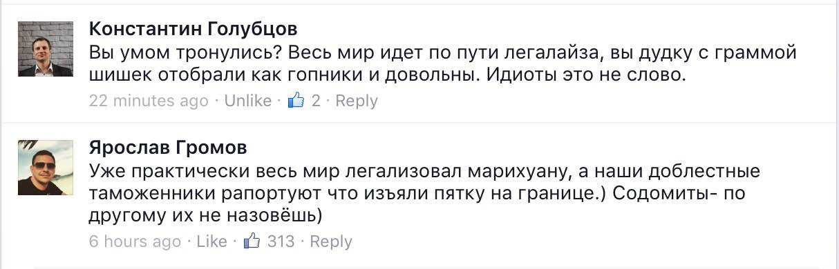 «Вы умом тронулись? – добавляет Константин Голубцов. – Весь мир идет по пути легалайза, вы дудку с граммом шишек отобрали как гопники и довольны. Идиоты не то слово».
