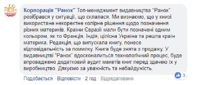 "Топ-менеджмент издательства "Ранок" разобрался в ситуации. Мы признаем, что в книге использовано некорректное цветовое решение относительно обозначения различных материков. Страны Евразии должны быть обозначены одним цветом, как Франция, Индия, целостная Украина и остальные страны материка. Редакция, выпускавшей книгу, понесет ответственность за ошибку. Книга будет снята с продажи", – отметили в компании.