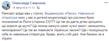 "Это так вы даете детям понять, что агрессия это круто? Что можно хапнуть кусок чужой земли и остаться безнаказанным? Это так вы уважаете украинские законы?", – возмущается Сапронов.