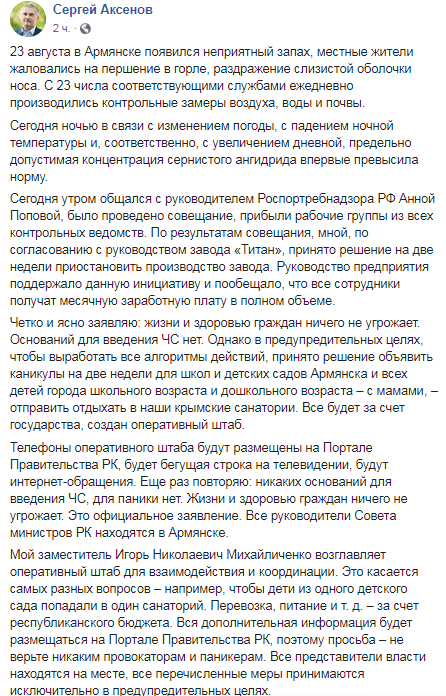 "Оснований для введения ЧС нет. Однако в предупредительных целях.. принято решение объявить каникулы на две недели для школ и детских садов Армянска и всех детей города школьного возраста и дошкольного возраста – с мамами, – отправить отдыхать в наши крымские санатории", – говорится в сообщении.