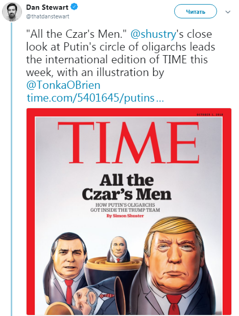 Фото продемонстрировал редактор журнала Дэн Стюарт на своей странице в Twitter. Такая титульная страница, с заголовком "Все люди царя. Как олигархи Путина попали внутрь команды Трампа", украсит октябрьский номер издания.
