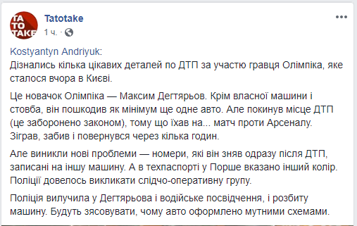 "Номера, которые футболист снял после ДТП, принадлежат другому автомобилю, а в техническом паспорте разбитой машины указан другой цвет. Полиция изъяла у Дегтярева водительское удостоверение и разбитую машину. Правоохранительные органы будут выяснять, почему авто оформлено мутными схемами", - написал у себя в Facebook футбольный журналист Константин Андриюк.