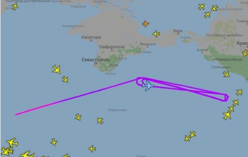 Как можно увидеть на опубликованной карте полета, самолет подлетел к оккупированному Крымскому полуострову с запада, пролетел вдоль его южного берега, повернулся в сторону российского побережья Черного моря и сделал несколько кругов рядом с Керченским проливом.