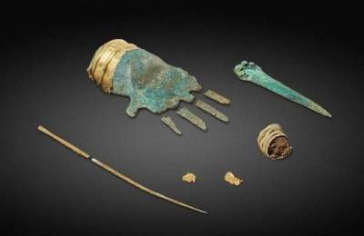 Кроме руки археологам удалось раскопать кинжал и человеческое ребро. Специалисты сообщают, что рука была отлита из бронзы и золота. Ее размер скорее соответствует детскому.