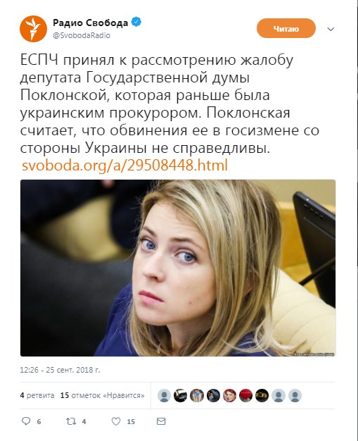 Экс-руководитель так называемой "прокуратуры" Крыма Наталья Поклонская подала в Европейский суд по правам человека (ЕСПЧ) жалобу на "несправедливость" украинских судов.