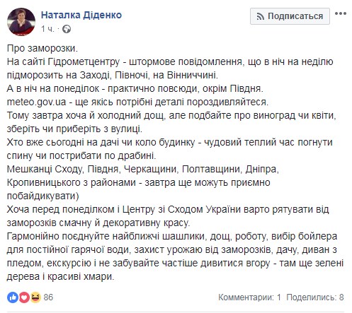 "На сайте Гидрометцентра - штормовое сообщение, что в ночь на воскресенье подморозит на Западе, Севере, на Виннитчине. А в ночь на понедельник - практически везде, кроме юга. Жители востока, юга, Черкасской, Полтавской, Днепра, Кропивницкого с районами - завтра (в субботу, 29 сентября, - прим. ред.) еще могут приятно побездельничать", - написала она.