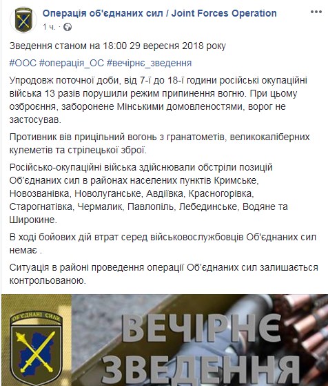 В зоне боевых действий на Донбассе за субботу, 29 сентября, зафиксировано 13 обстрелов со стороны пророссийских боевиков, в результате чего раненых и погибших у ВСУ нет.