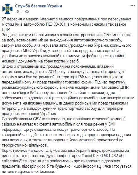 "Во время пересечения российско-украинской границы он снял номерные знаки так называемой "ДНР", но при въезде в Киев снова установил их, по его словам, "для обеспечения соответствия регистрационных автомобильных номеров пакету документов на указанную машину, выданных российскими представителями Интерпола, на случай остановки транспортного средства для проверки сотрудниками полиции Украины", - привели пояснения водителя представители СБУ.