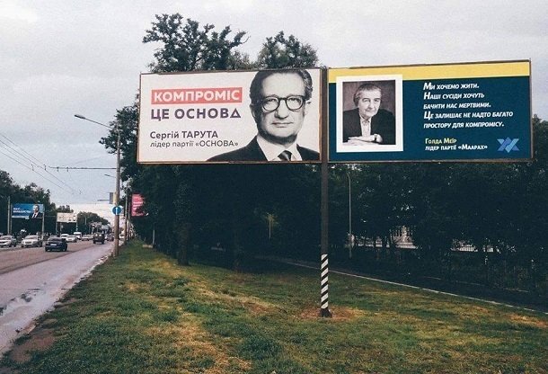 Так недавно в соцсети попал эпический снимок рекламы партии "Основа" с портретом Таруты. На соседнем билборде изображен портрет бывшего премьер-министра Израиля Голды Меир и цитата из ее выступления: