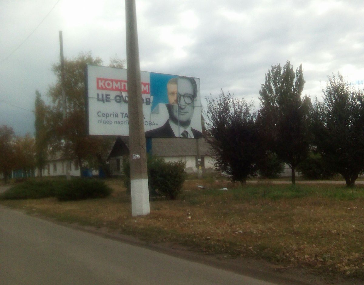 "Борд в Лисичанске. Вилкул лезет из Таруты. Какая шикарная инсталляция. Борд надо было бы срезать да передать в музей украинской политики, если бы такой был", - отметил он.