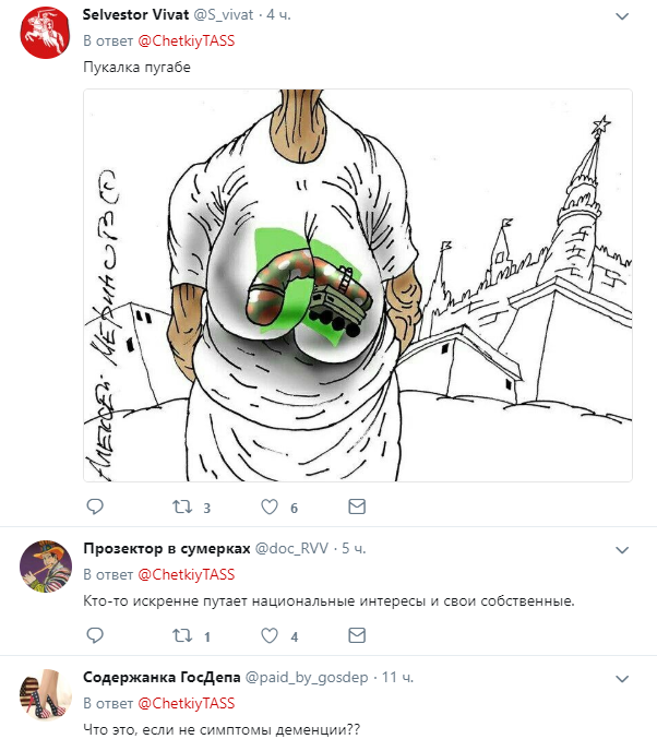 "Дед е * нулся уже окончательно. Самое страшное, что от умственного состояния и детских травм этого ушльопка зависит судьба 140000000 людей, и это минимум", - прокомментировал в Twitter заявление Путина Четкий ТАСС.
